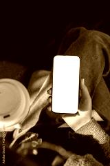 A close-up of a woman sitting in a coffee shop, uses her smartphone and sips her coffee.