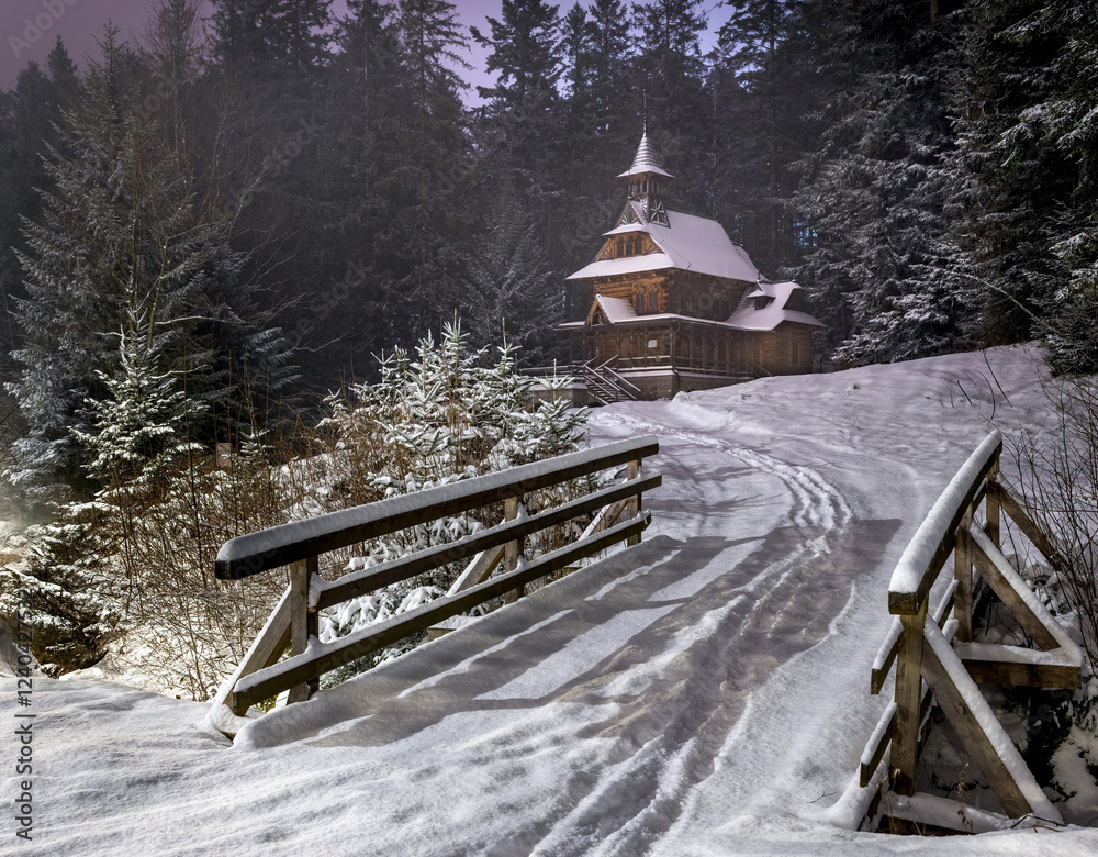 Zakopane: Kaplica na Jaszczurówce w śnieżny, mroźny poranek z opadami śniegu