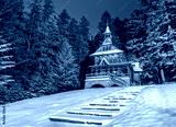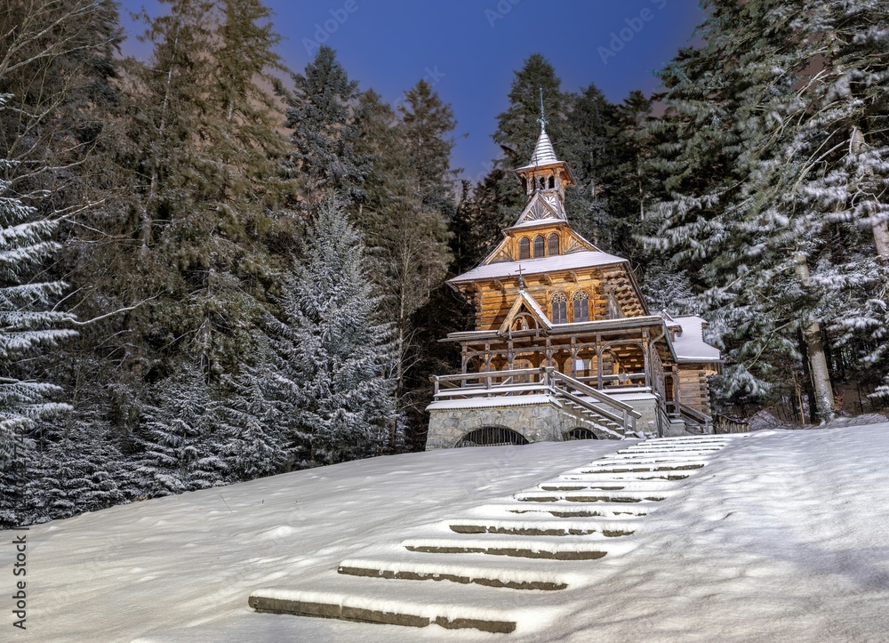 Zakopane: Kaplica na Jaszczurówce w śnieżny, mroźny poranek z opadami śniegu