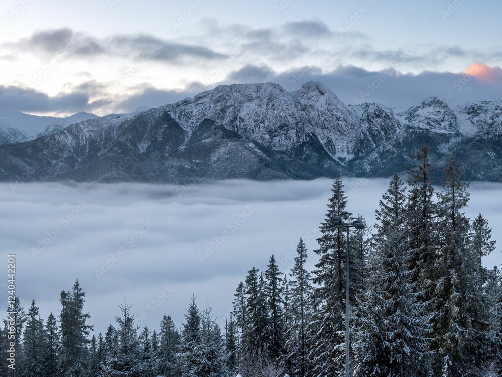 Poranny, zimowy widok z Gubałówki w stronę Tatr w bardzo mroźny poranek z mgłą