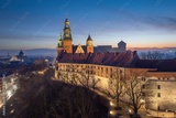 Zamek Królewski na Wawelu z Wieżą Zegarową po renowacji. Widok z drona o poranku