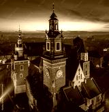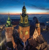 Zamek Królewski na Wawelu z Wieżą Zegarową po renowacji. Widok z drona o poranku