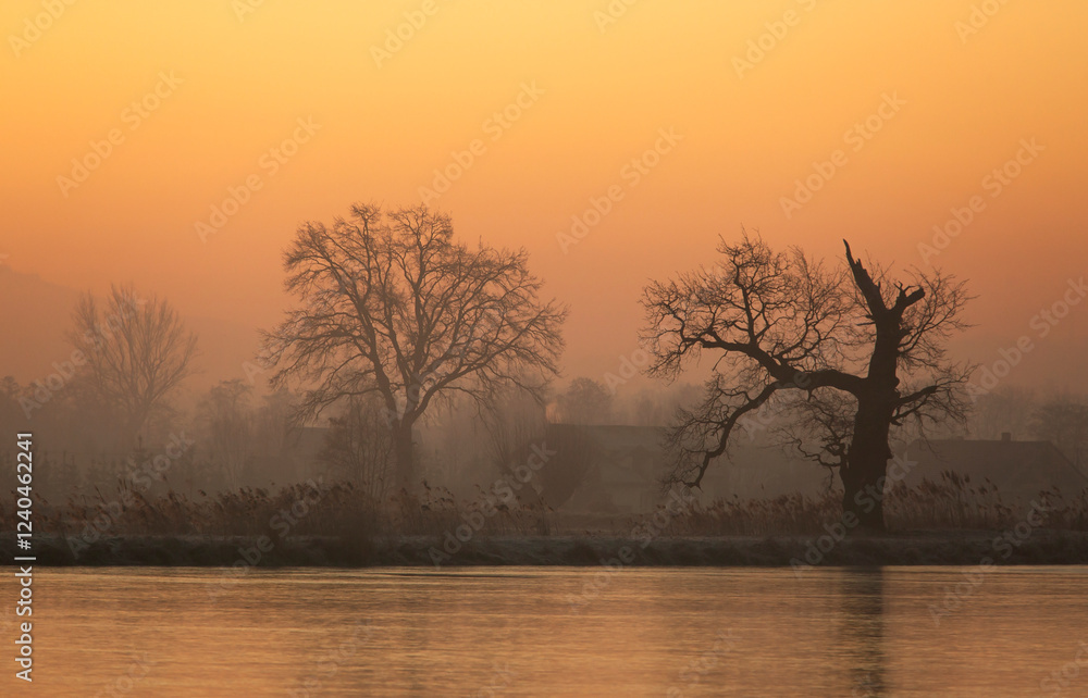 Zimowy, mglisty poranek nad stawem, wschód słońca.