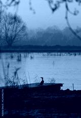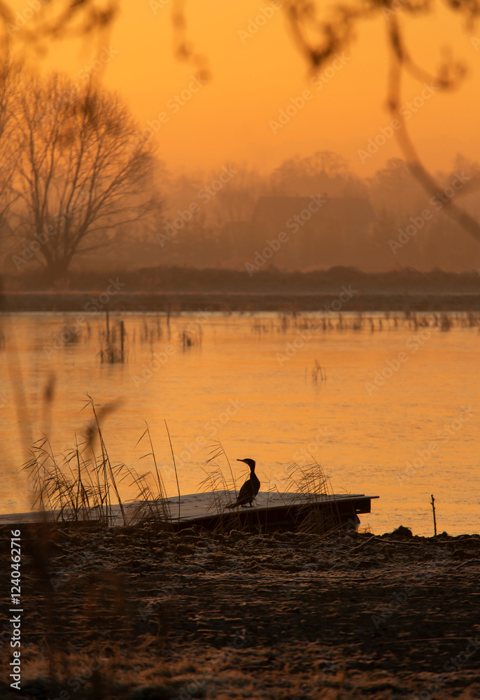Zimowy, mglisty poranek nad stawem, wschód słońca.