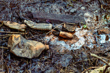 Various kinds of trash waste objects a lot floating in the pond mixed with aquatic plants