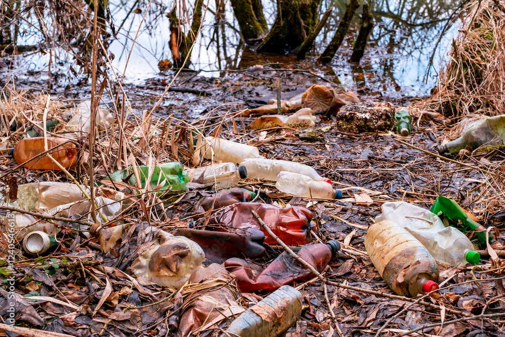 Various kinds of trash waste objects a lot floating in the pond mixed with aquatic plants