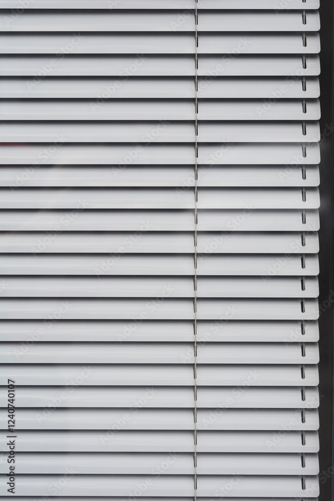 A close-up of closed white metal horizontal blinds, showcasing their parallel lines and subtle shadows