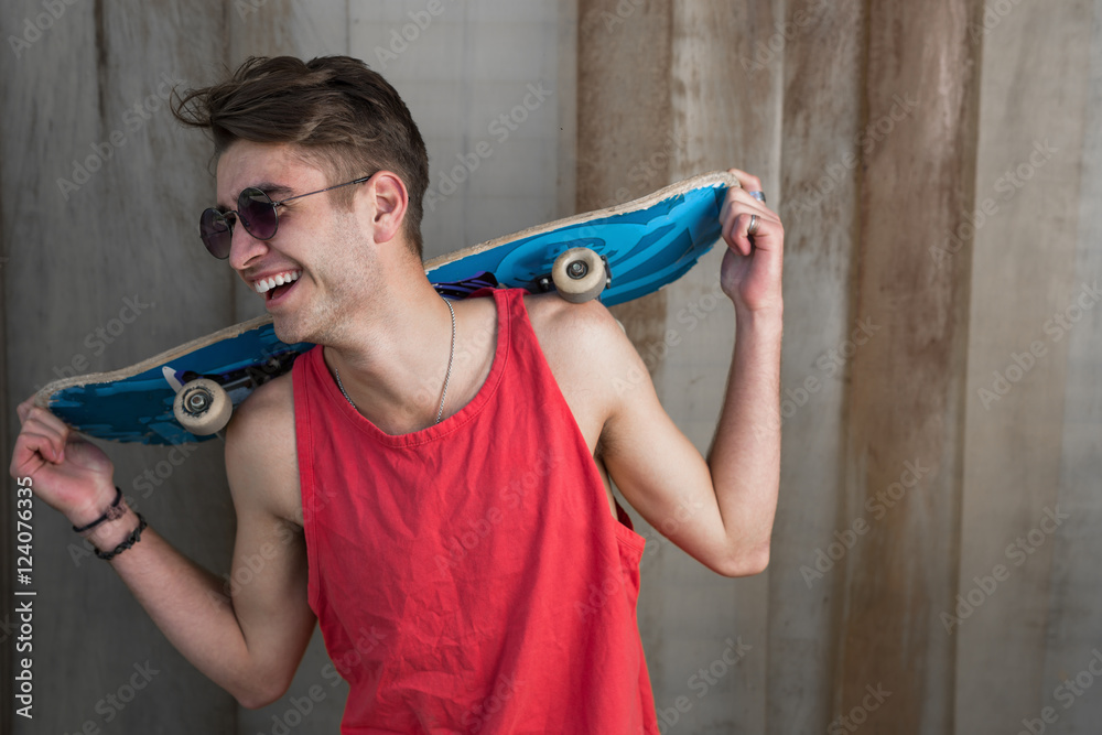 Portrait of cool teenage boy with a skateboard on his shoulder