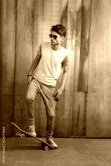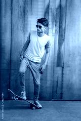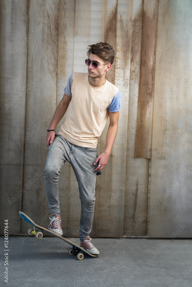 Handsome man posing with skateboard near the wall