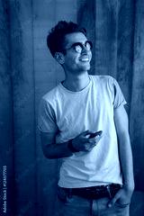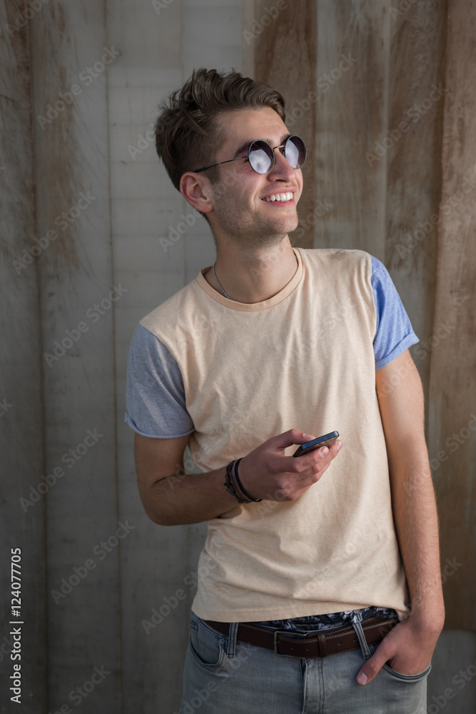 Funny hipster handsome man guy in stylish summer cloth in the st