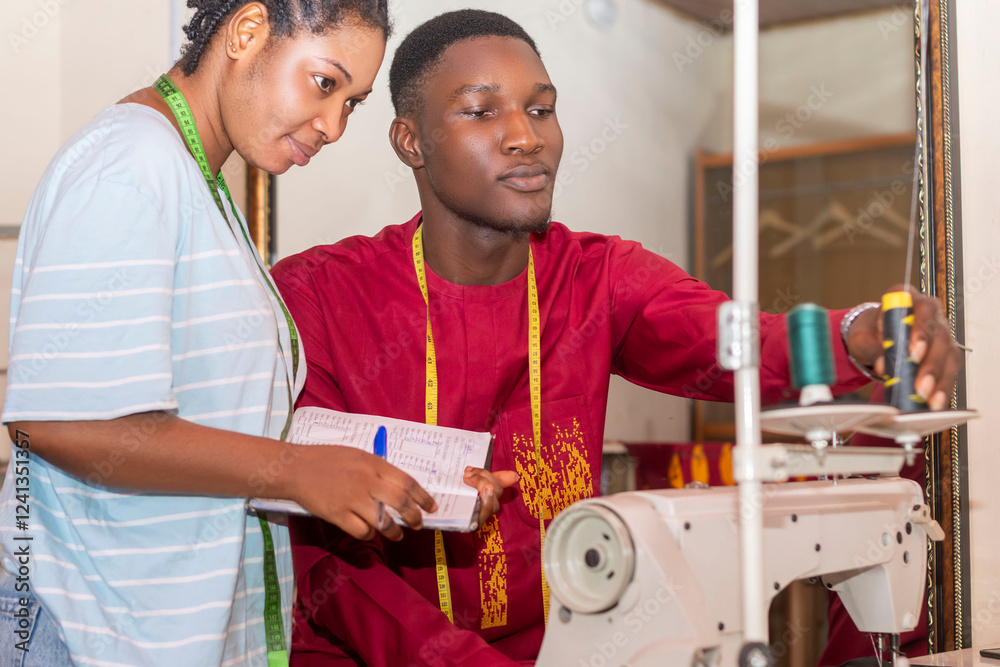 Young female trainee African-American ethnicity, learning craft from a male tailor
