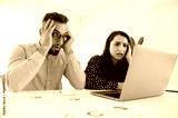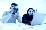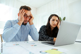 Puzzled stressed coworkers analyzing data and charts on a laptop and printed sheets at a desk, working together to solve a problem while sitting in the office, experience confusion and disappointment