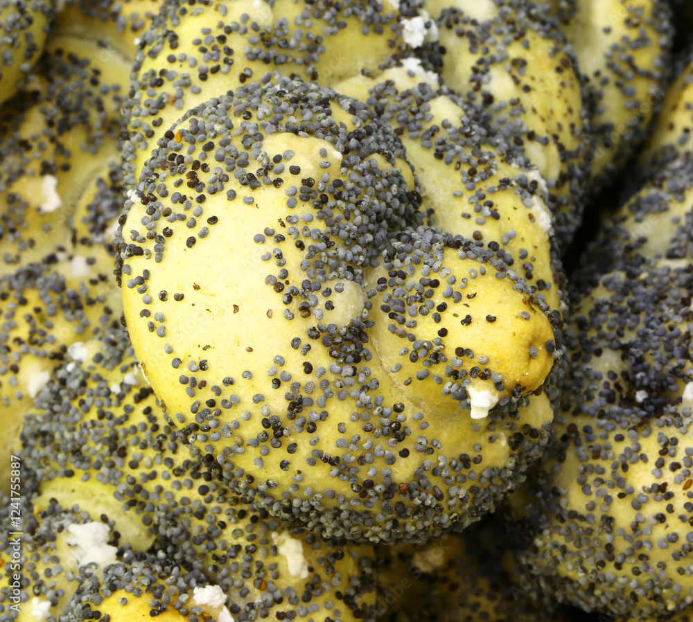 Turmeric bread garnished with black poppy seeds for sale in a bakery