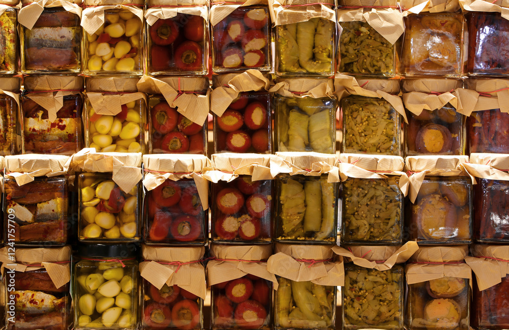 jars of food preserved in oil or pickled for sale at the stall of preserved food typical of southern Italy.