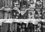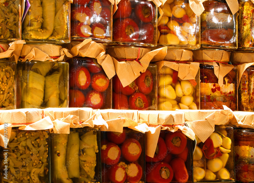 jars of food preserved in oil or pickled for sale at the stall of preserved food such as peppers and anchovies