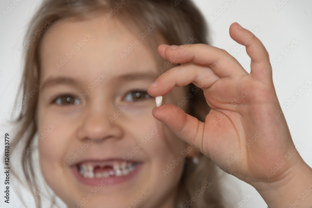 A happy baby girl shows off her first tooth that fell out and smiles happily.