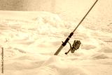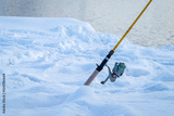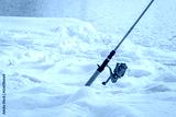 fishing rod on a snowy lake shore - partially frozen Horsetooth Reservoir