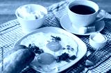 Breakfast with scrambled eggs, bread, butter, coffee.