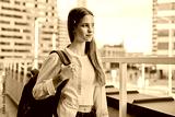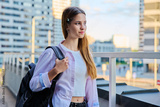 Portrait dreaming girl high school, college student with backpack outdoor