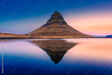 Amazing sunset view of the Kirkjufell. Symmetric reflection over the lake, Iceland