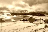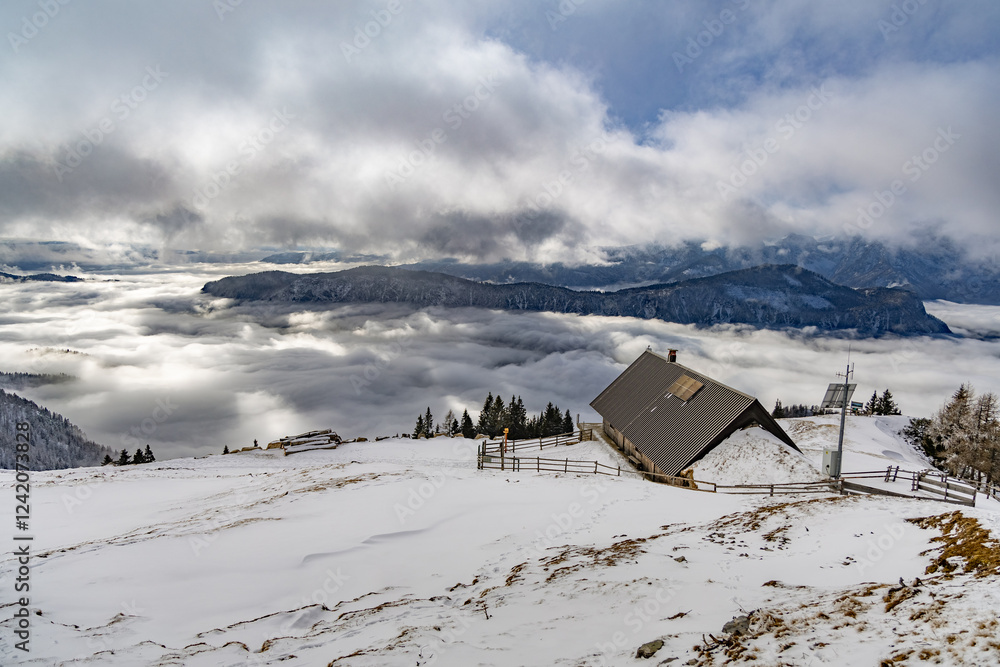 Sunrays shining on low cloud cover of the Sava valley, Slovenija