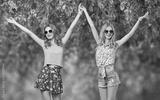 Sisters Friends Crazy Enjoy Autumn Nature. Fall Fashion. Urban Model Woman in Fashion Outfit Having Fun. Autumn Outdoor Park. Glamour Sexy Hipster Girl, fashion Trendy Hairstyle, Stylish Sunglasses.
