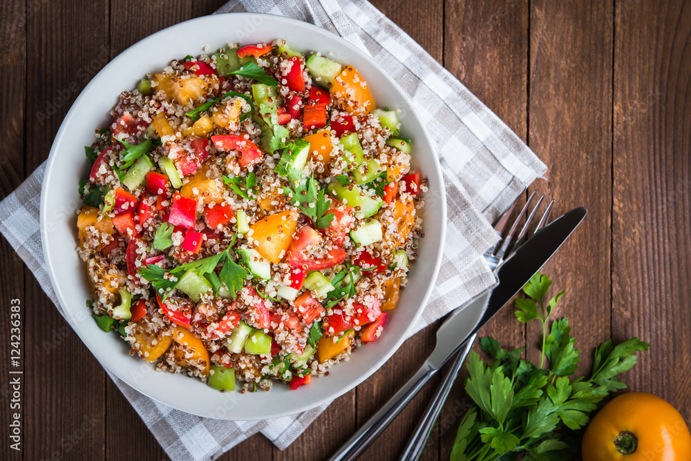 Fresh healthy salad with quinoa, colorful tomatoes, sweet pepper, cucumber and parsley on wooden background top view. Food and health. Superfood meal.