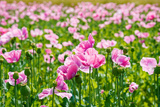 Panorama of a field of rose corn poppy. Beautiful landscape view on summer meadow. Germany.