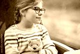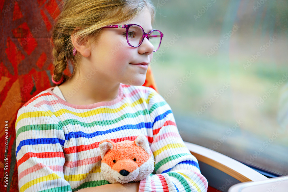 Happy little girl with glasses and a colorful striped sweater sitting by a train window, holding a plush fox toy and looking outside with curiosity. Traveling child