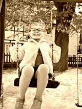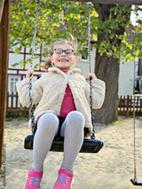 Adorable little girl having fun on a swing. Happy child on playground on sunny day