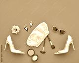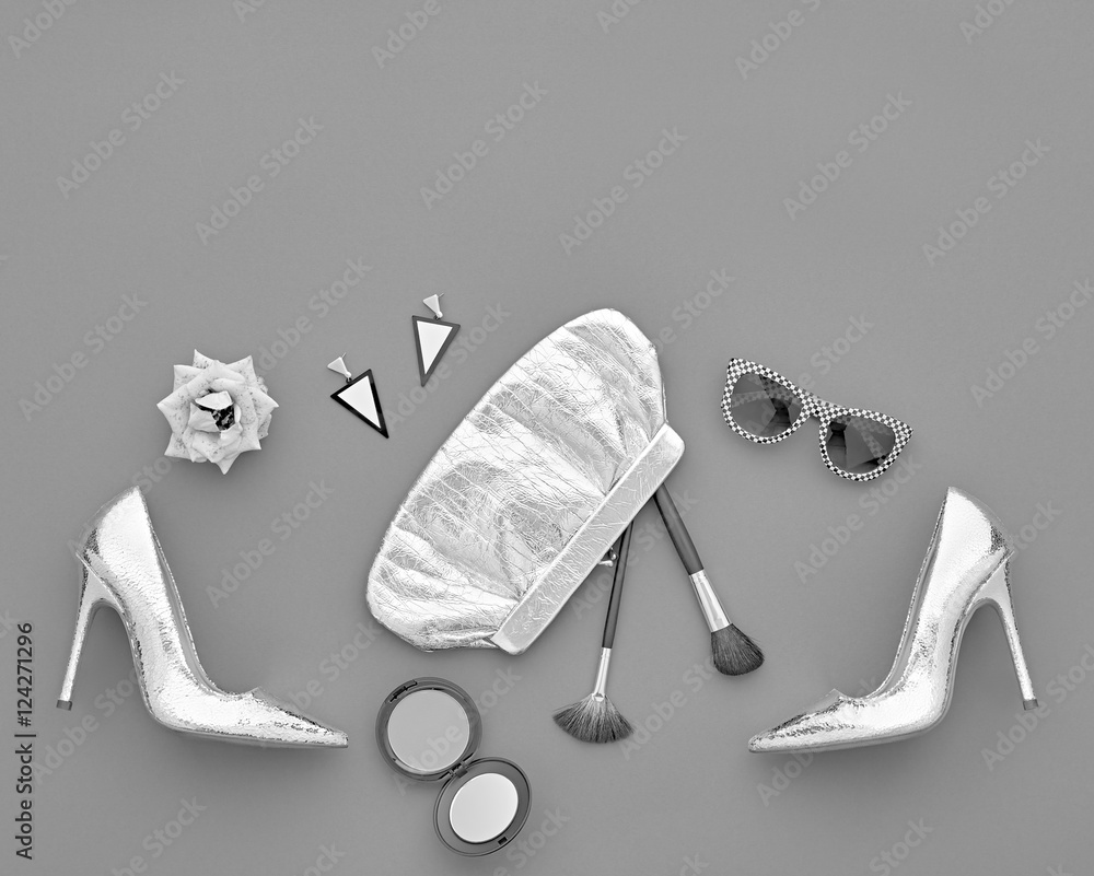 Fashion woman Clothes Accessories Set. Fashion Design Outfit. Black White. Essentials fashion Cosmetic Makeup. Stylish Glamor fashion Heels, Handbag Clutch, Rose. Top view. Creative.Minimal Monochrome