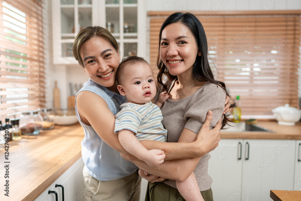 Portrait of Asian lesbian couple caring for and raising baby boy at home.