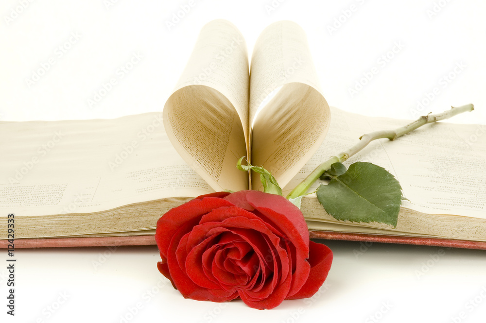 red rose on a book isolated on white background