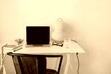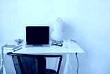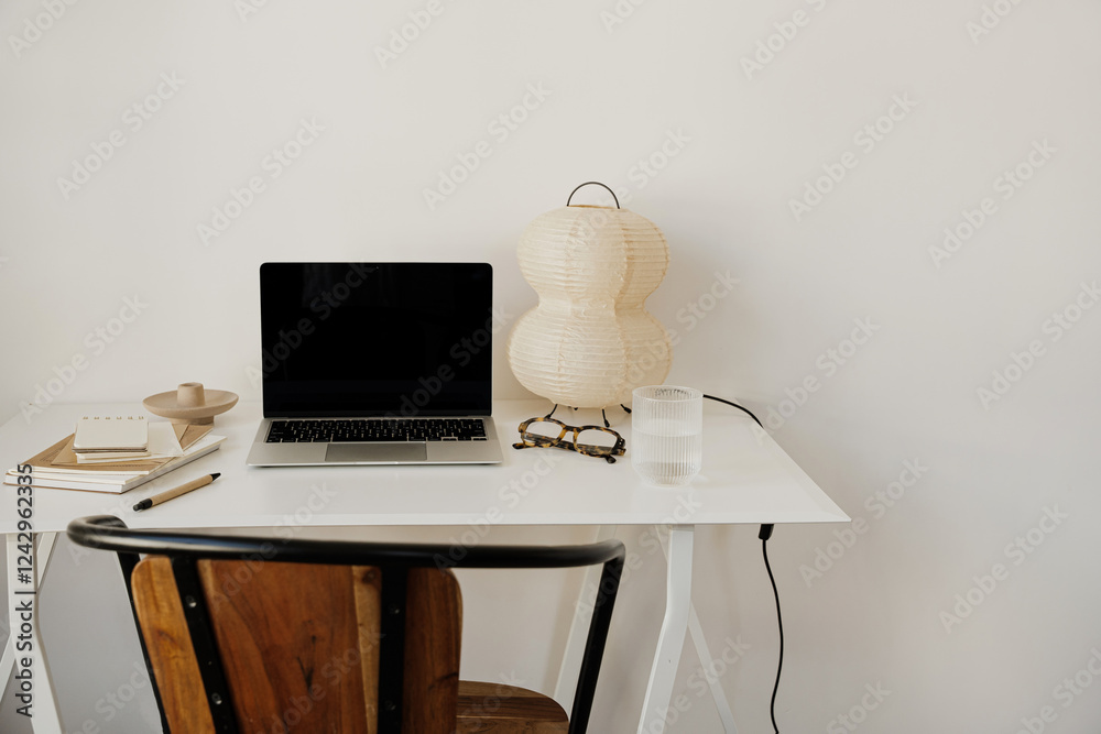 Organized office desk with laptop, glasses, and notebooks under gentle light of paper lamp