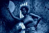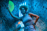 Young woman holding green hand fan dancing under blue neon lights