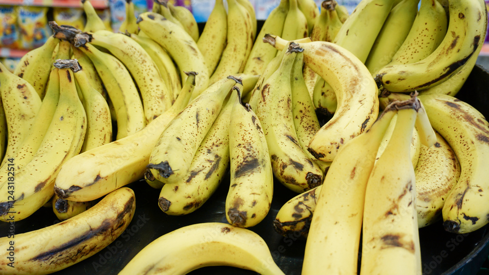 Pile of ripe bananas with dark spots, arranged in a grocery store for sale.