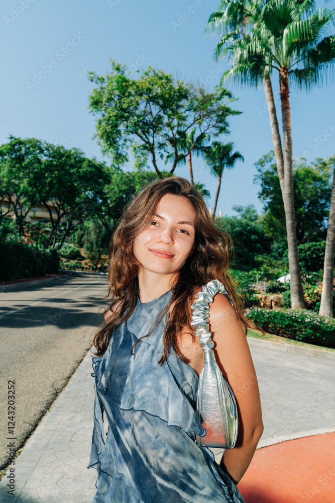 A smiling woman in a blue flowing dress and metallic bag poses on a sunny day surrounded by lush greenery and palm trees