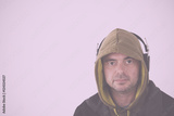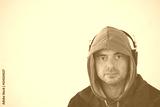 Man in hoodie listening to headphones Vintage Retro Filter.
