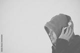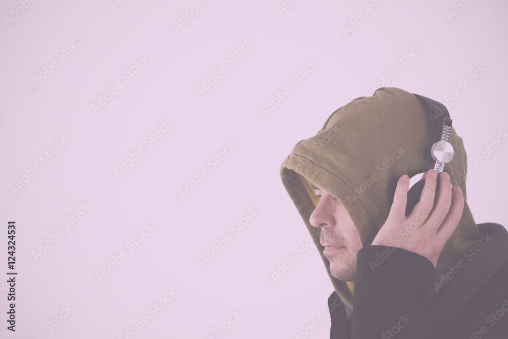 Man in hoodie listening to headphones Vintage Retro Filter.