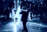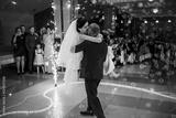 Wedding dance with bubbles. Bride and groom whirl in restaurant. dancing couple