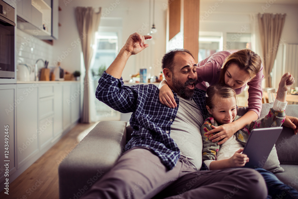 Young family using a digital tablet at home together while sitting on the couch in the living room