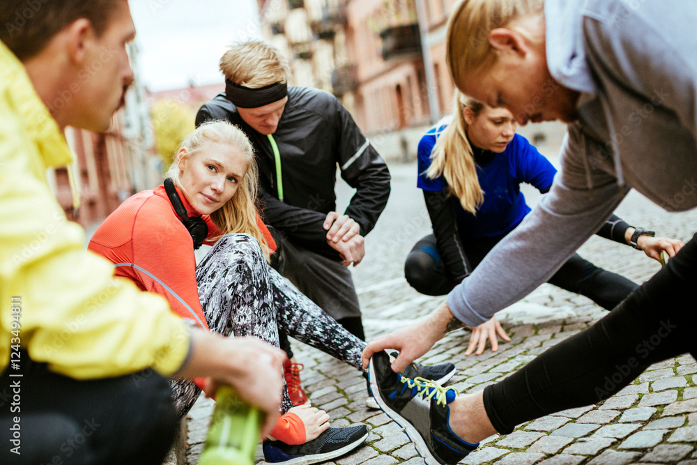 Young people stretching and getting ready to go jogging in the city