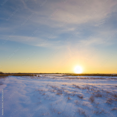 winter plain in a snow at the sunset, seasonal outdoor natural landscape