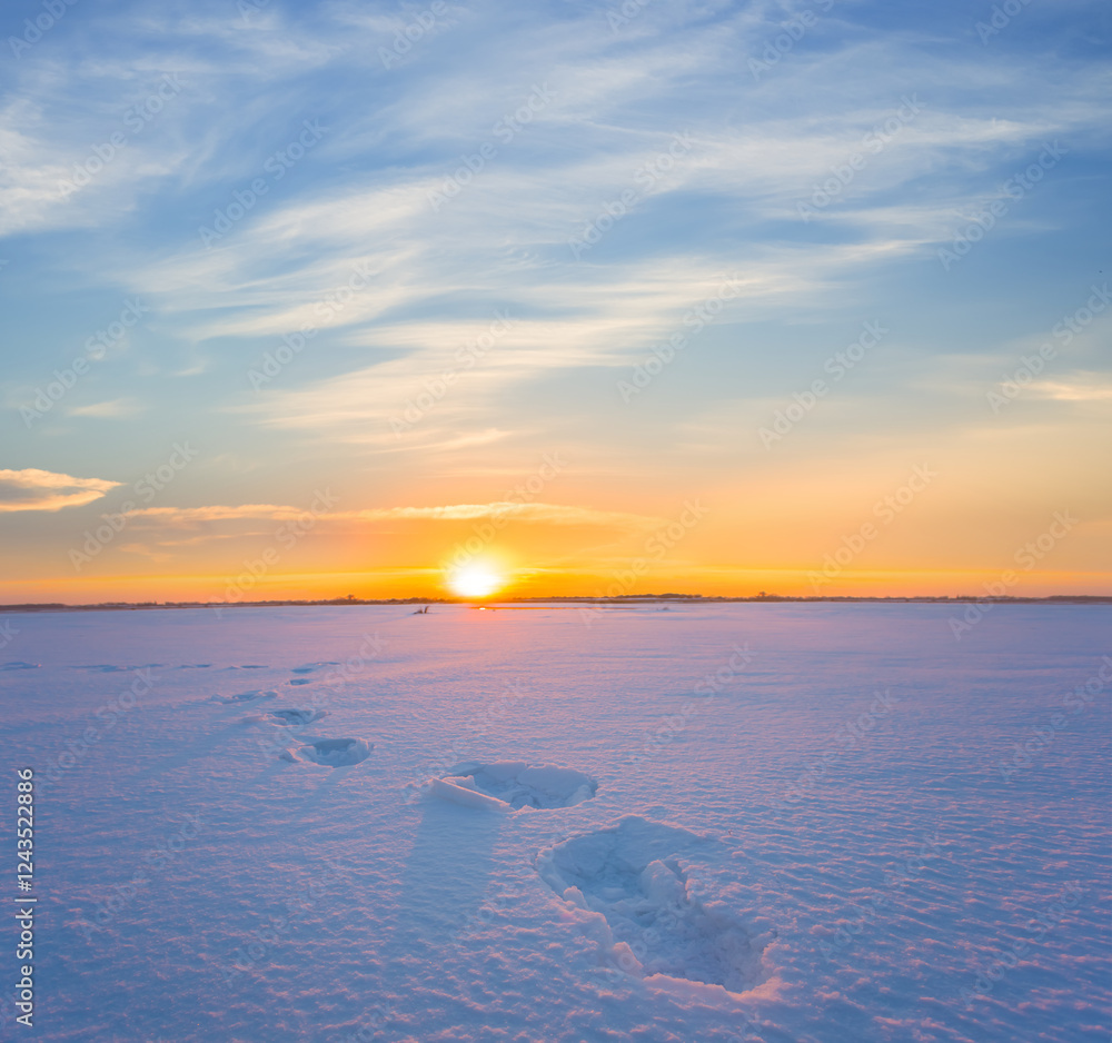 winter plain in a snow at the sunset, seasonal outdoor natural landscape
