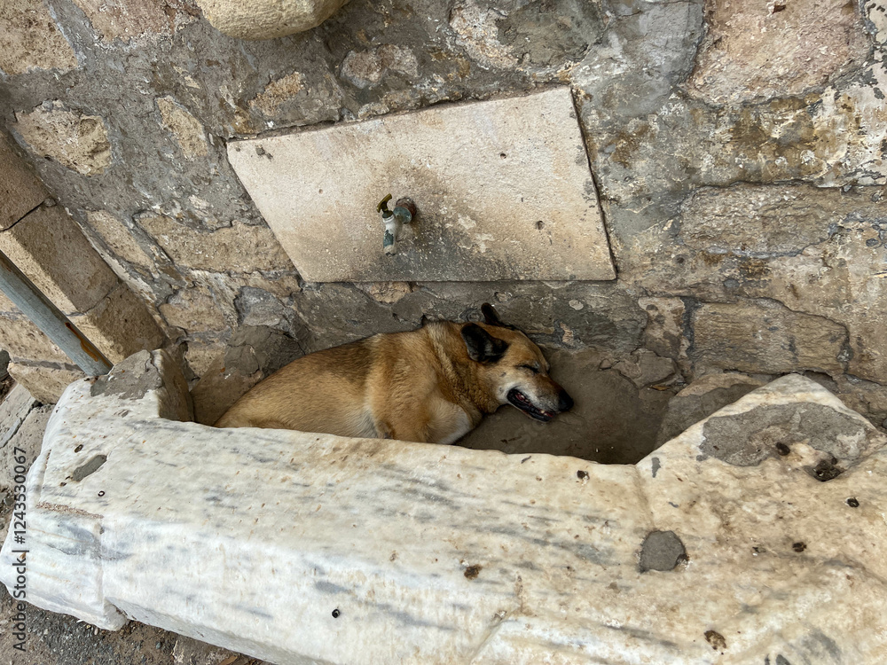 During the drought in Cyprus, near the monastery of St. Barnabas, in Enkomi, Cyprus, a brown dog lies in a container, under a tap due to the heat