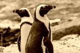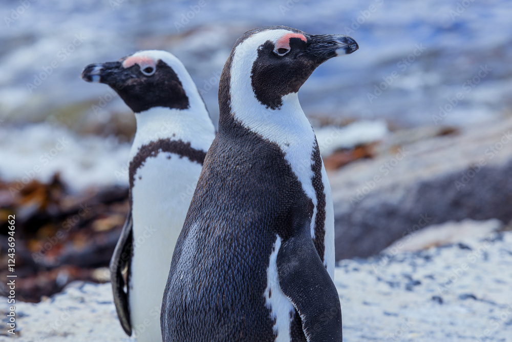 African penguins on a sandy shore by the ocean in South Africa during the day