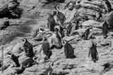A gathering of African penguins on rocky shores in South Africa during a sunny day