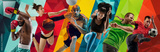 Multisport diversity. Athletes engaged in boxing, basketball, volleyball, soccer, and tennis game. Strength, teamwork and determination. Concept of professional sport. Horizontal banner, ads.