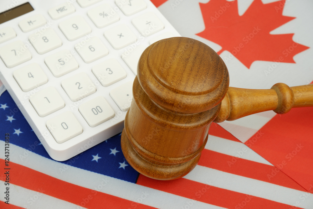Rules of trading between United States and Canada. USA and Canadian flags under judge gavel and calculator.