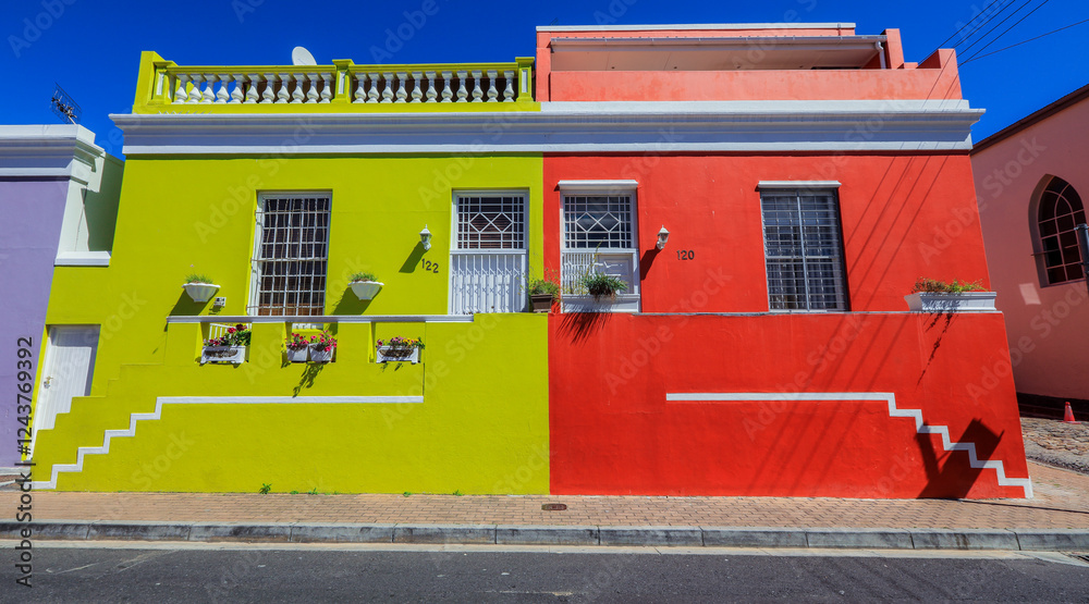 Colorful buildings in Bo Kaap, Cape Town, highlight unique architecture in daylight